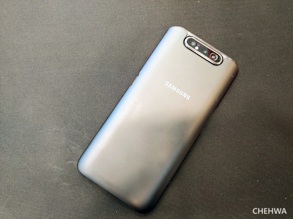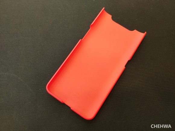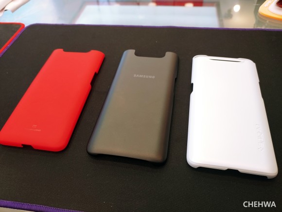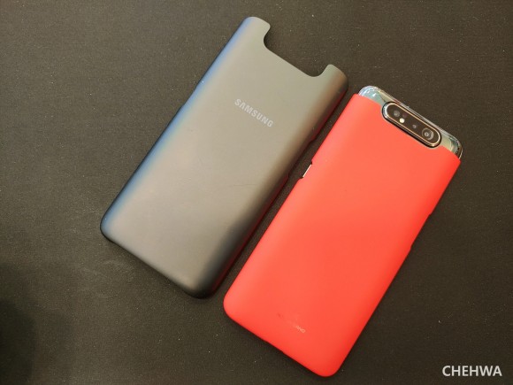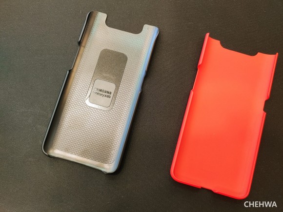 갤럭시 A80 제품내 포함된 케이스에 비해 윗 부분이 짧게 만들어져 있습니다.