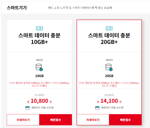 태블릿PC 나 LTE 노트북에 사용 가능한 스마트기기 알뜰 요금제 입니다.