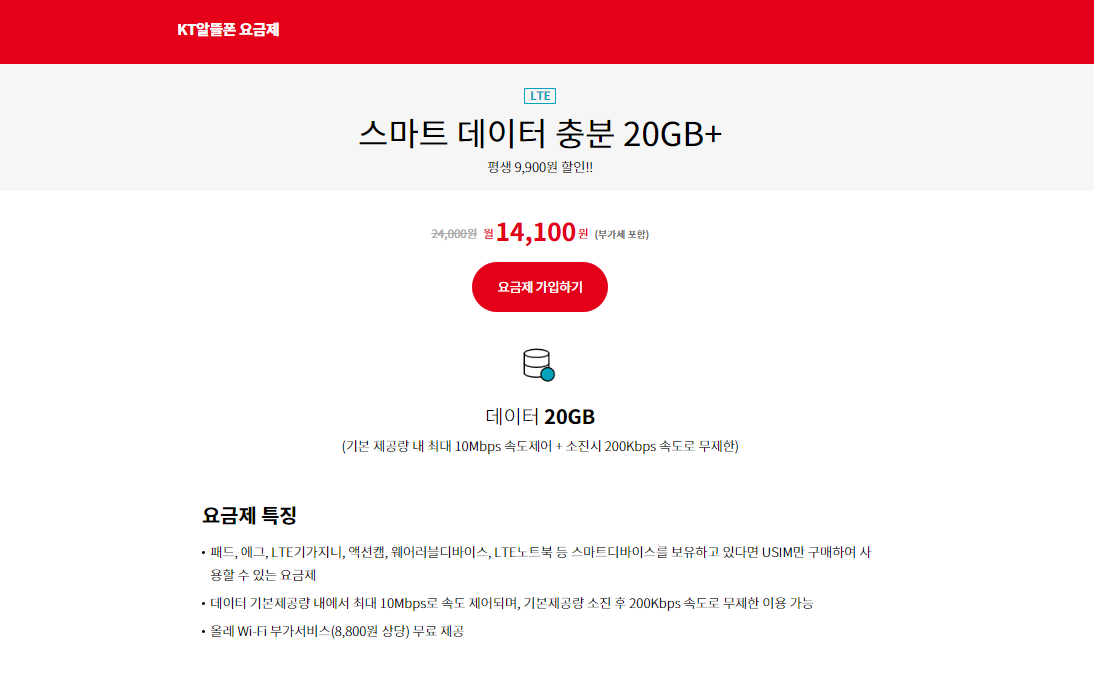 "스마트 데이터 충분 20GB+ 14,100원"가 가성비 좋으니~