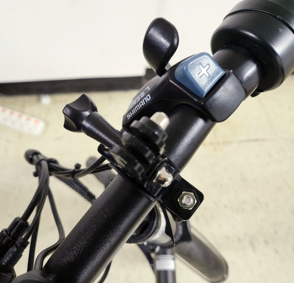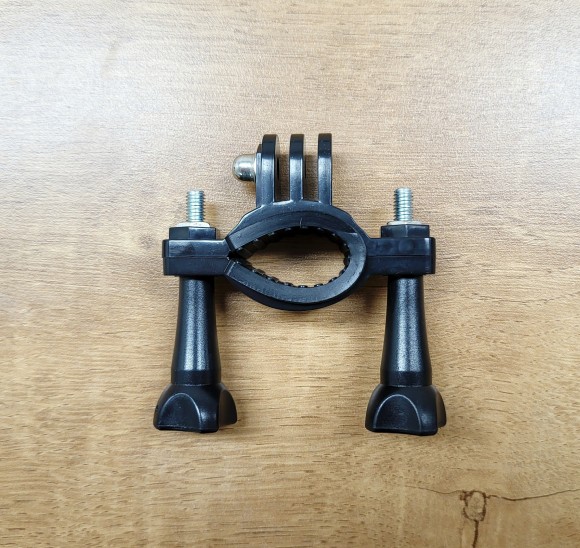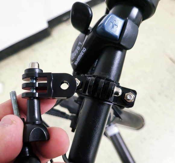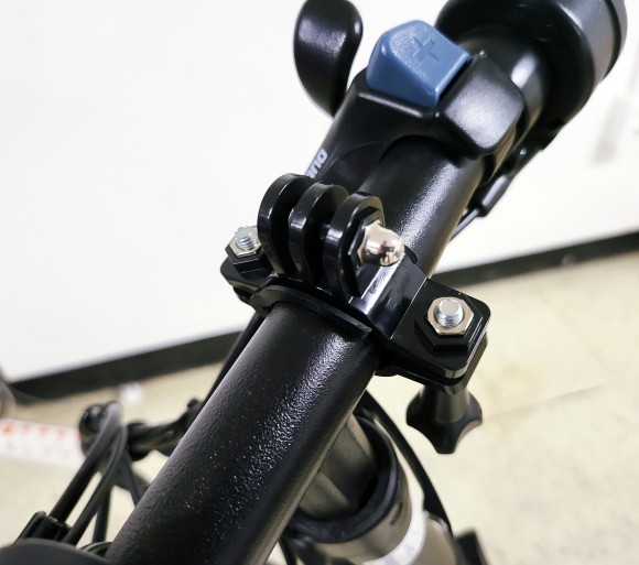 핸들바 마운트만 연결하니 액션캠이 정면을 바라보지 않아서, 추가 마운트를 결합했습니다