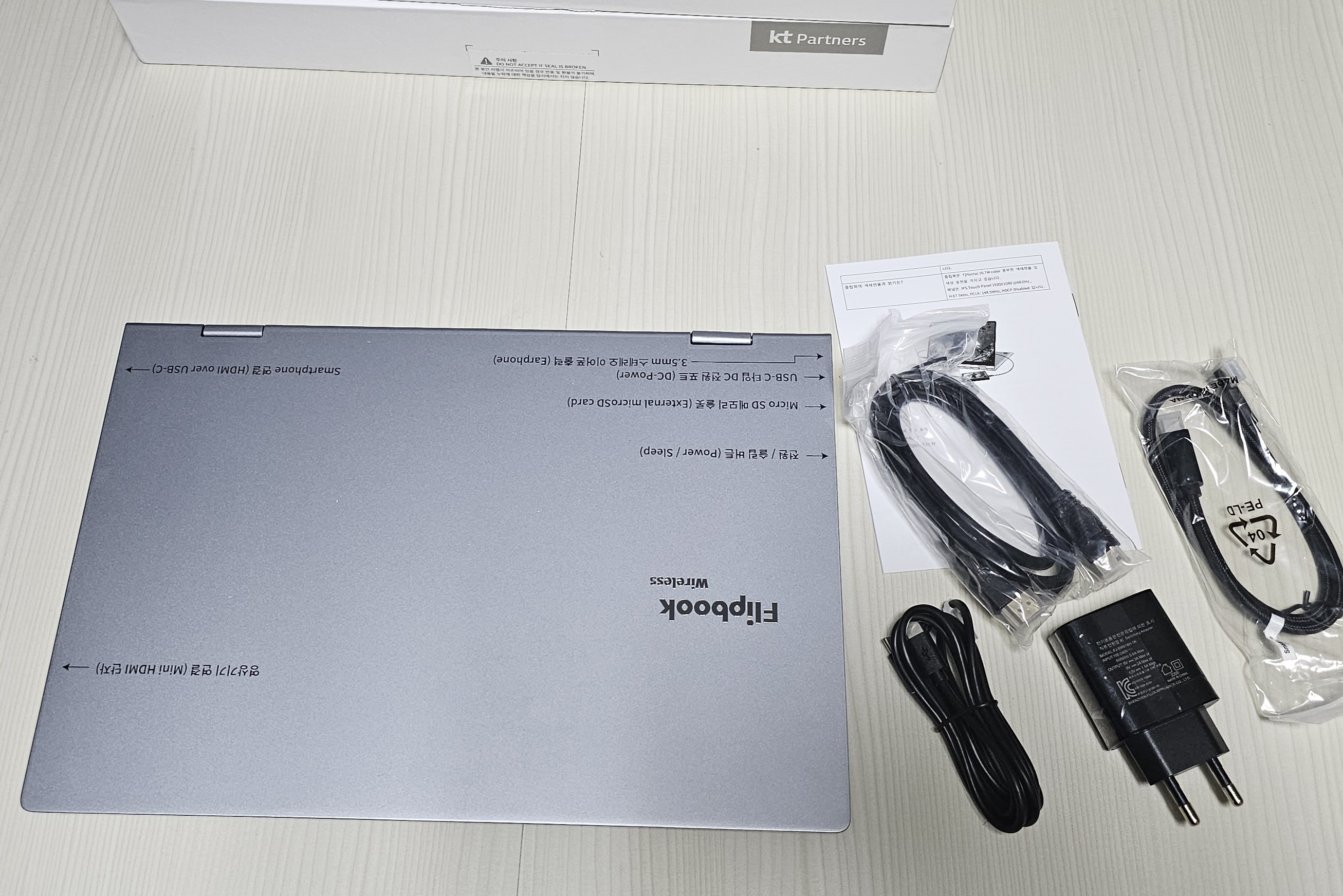 제품 구성품 : FLIPBOOK 본체, C to C 케이블 40cm (스마트폰연결용), C to C 케이블 1.5m (플립북 충전용), Mini HDMI to HDMI 케이블 1m, USB-C포트 AC어댑터, 설명서