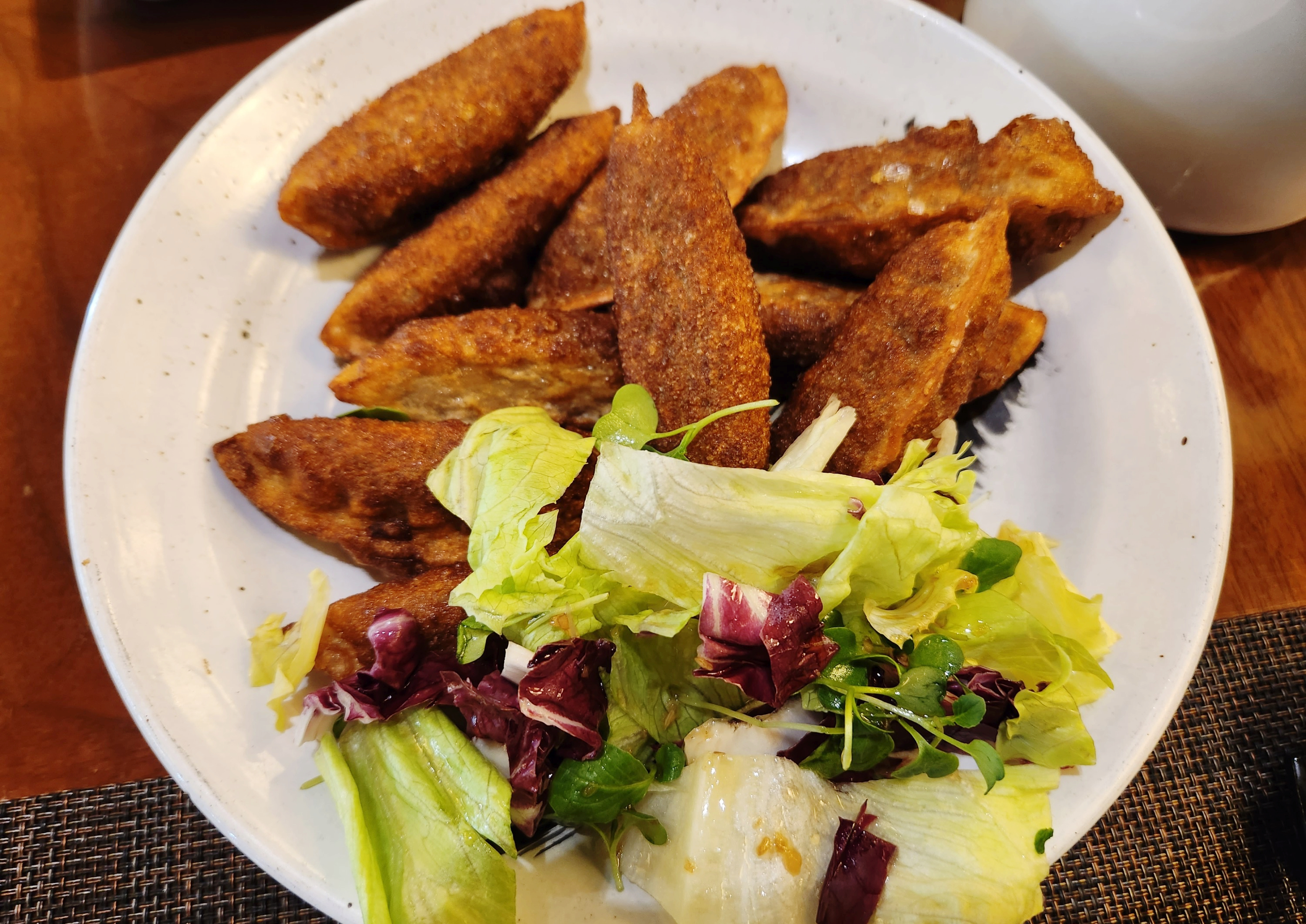 먹어보니 불고기만두를 튀긴 것 같아요. 단맛이 강한데~ 야채랑 같이 먹으면 딱!