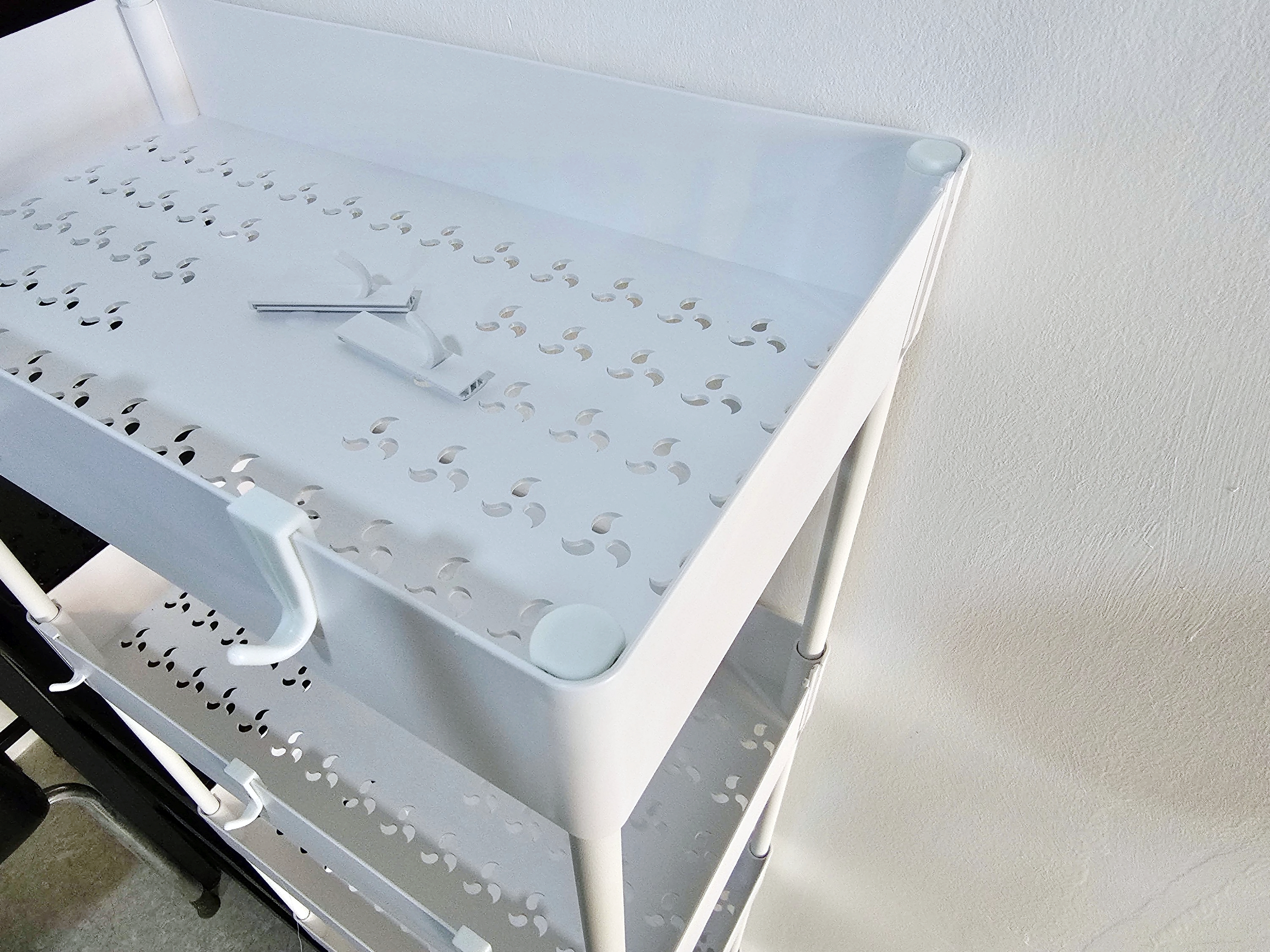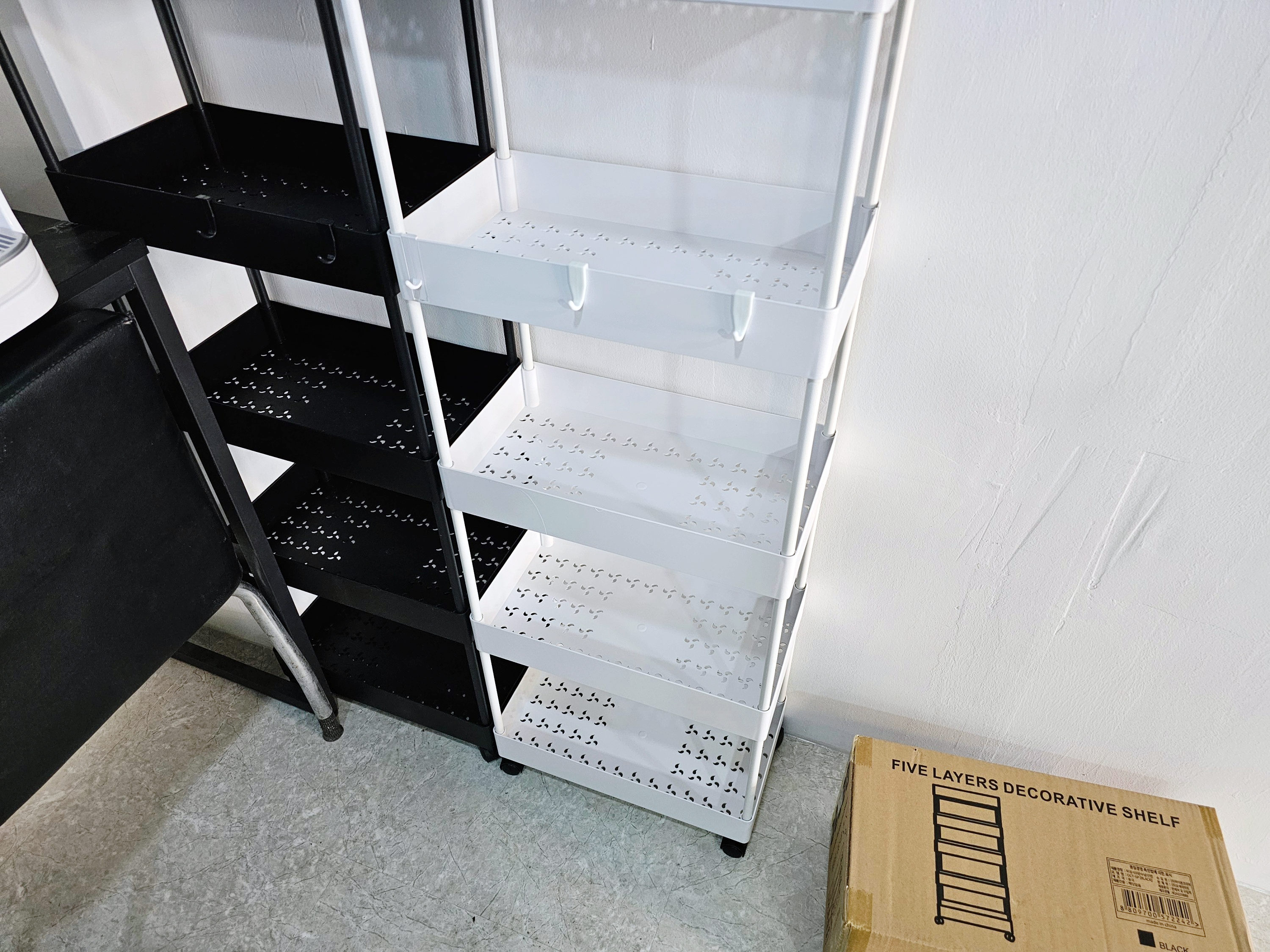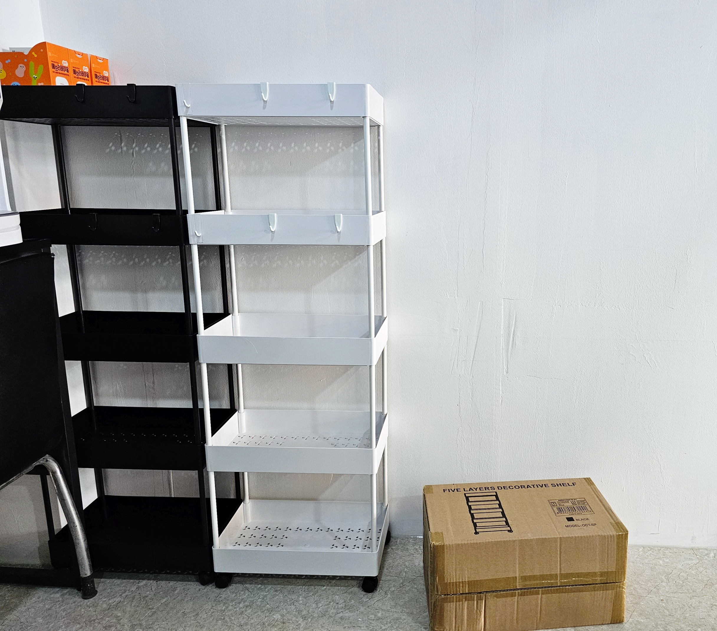 위 사진은 보스위즈 이동식 무빙 5단 트롤리 철제 수납함 선반 BOS-5P 입니다.