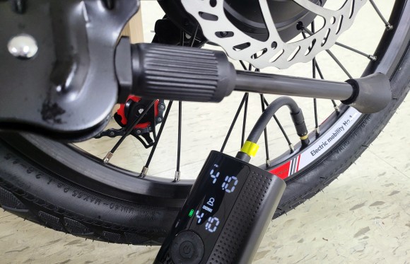 공기압을 얼마나 넣어야 하나.. 설명서를 참고해보니 적정 공기 압력은 타이어 옆면에 각인된 최대 공기 압력의 60~70% 만큼 주입하라고 써져있어서 공기 주입기를 챙겨왔습니다.