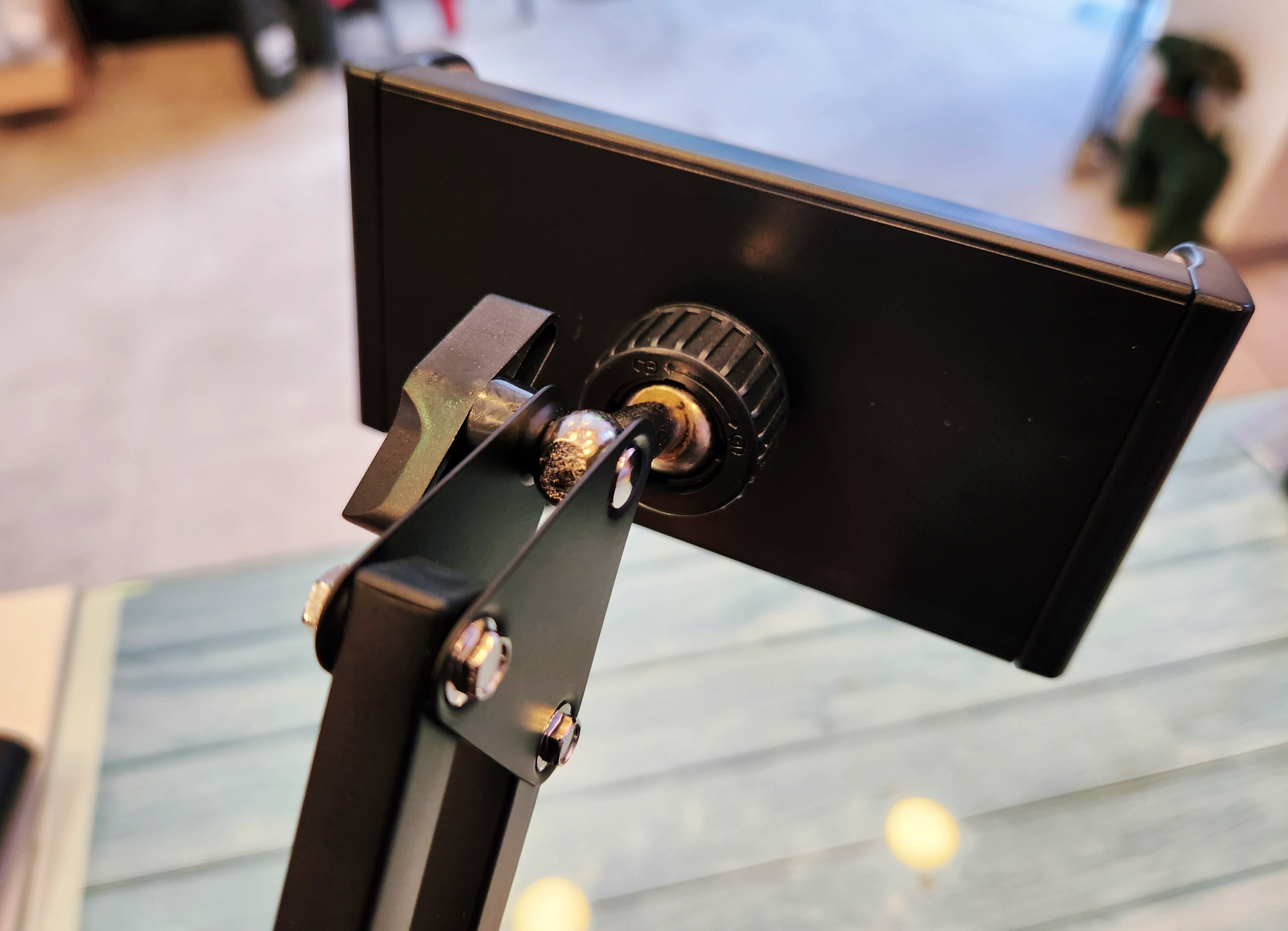 태블릿이나 스마트폰을 고정하고, 각도를 정한뒤 나사를 조여줘야~ 고정 부분이 움직이지 않습니다~!