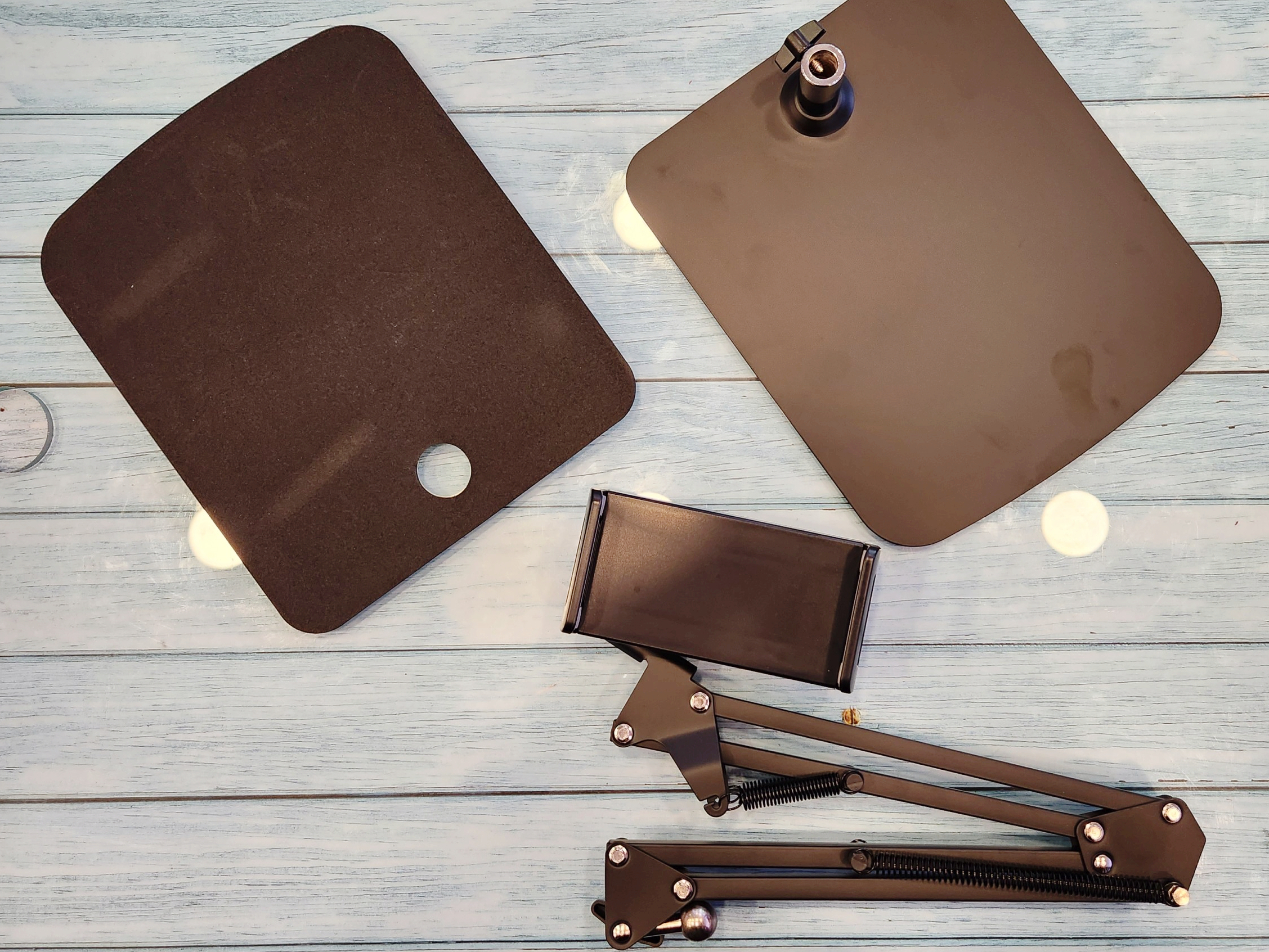 구성품은 거치홀더 / 컴퍼스 관절 / 받침대 / 미끄럼 방지 패드로 심플합니다.