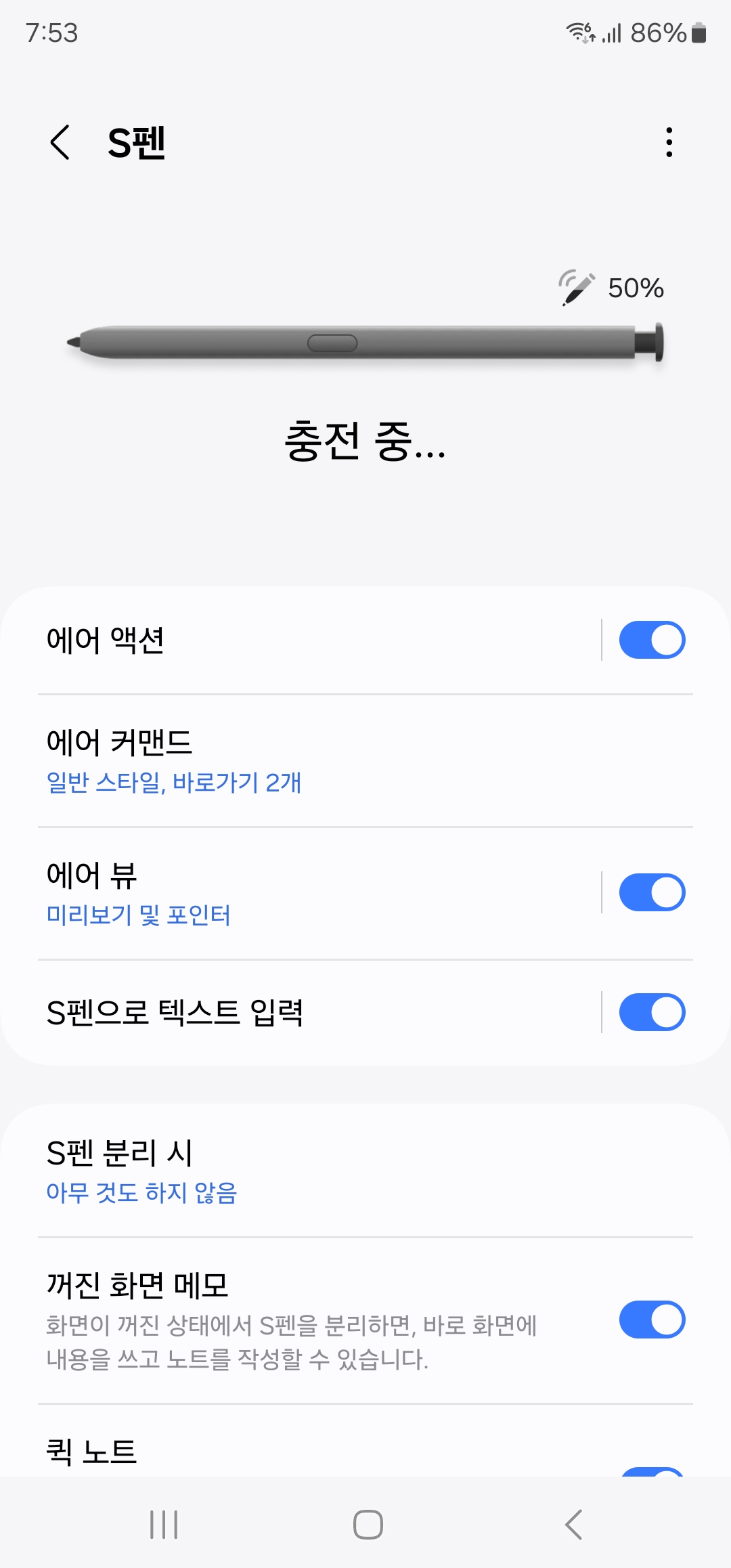 폰 상단에 S펜 연결 해제됨도 표시 되지 않았다.