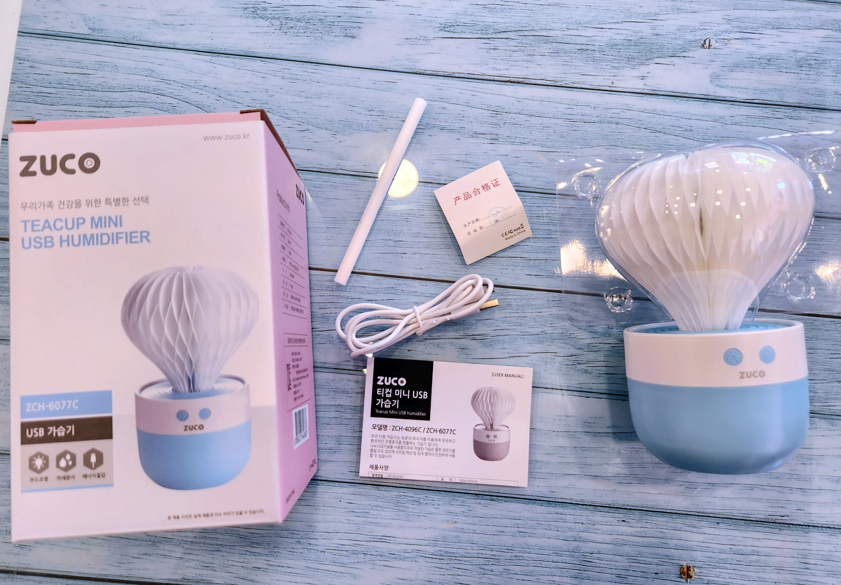 ZUCO 미니 가습기의 구성품은 본품, 설명서, 5핀 USB케이블, 여분 코튼필터 1개가 들어있습니다.