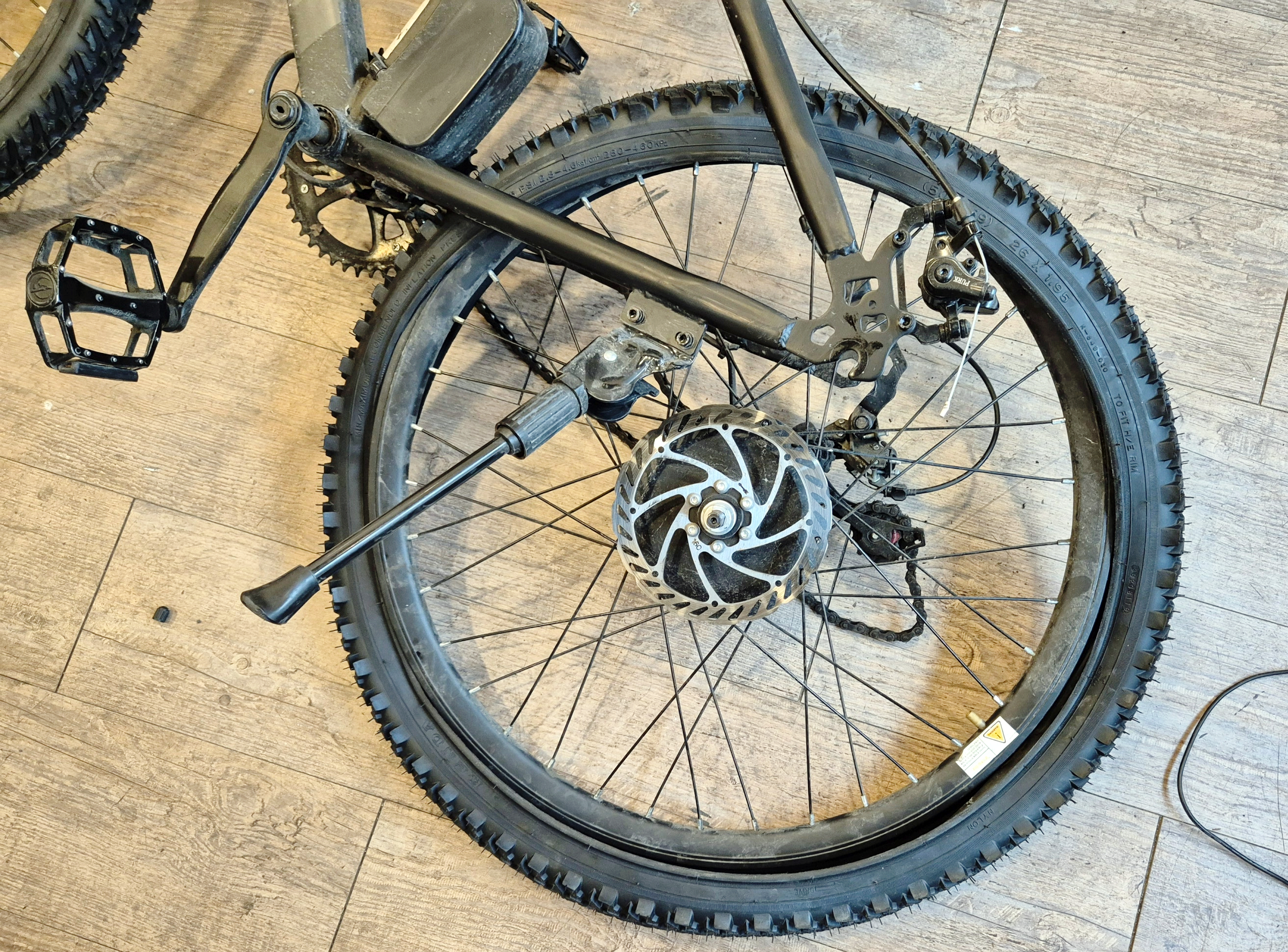 전기 자전거는 모터와 연결선이 뒷바퀴에 있다.